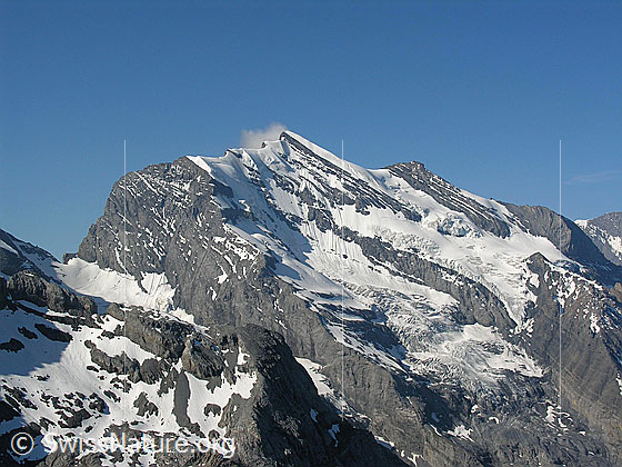 Doldenhorn und Kleindoldenhorn. Gut zu sehen sind: Fründenjoch, Ostgrat, Galletgrat und der obere Teil der Nordwand und der Verlauf der Normalroute. Davor der Doldenhorngletscher. |