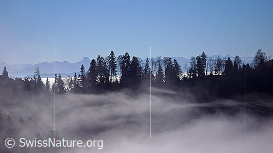 Nebelschwaden an der Nebelgrenze. Durch den lichten Wald auf der Krete ist die Stockhornkette zu sehen.